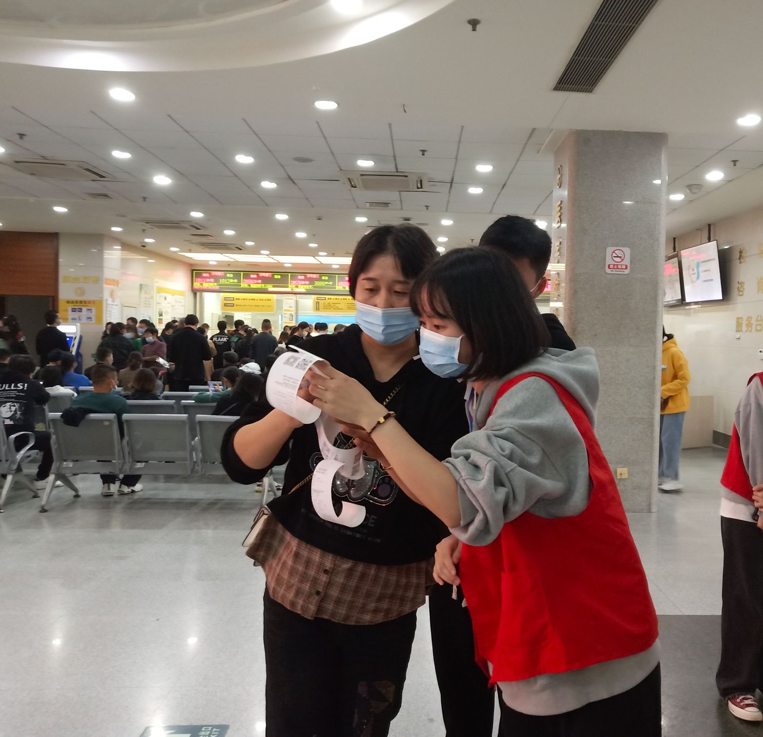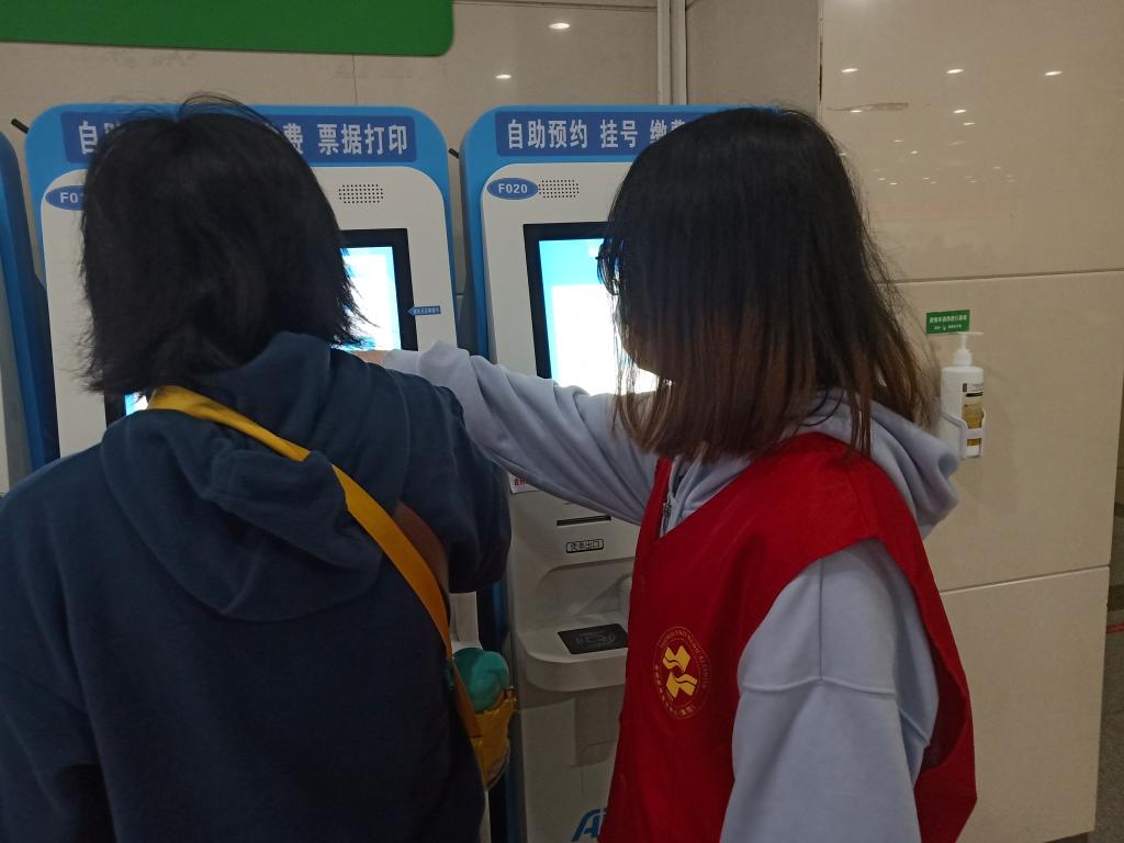 学生党员们身穿志愿者红马甲,胸前佩戴党徽,精神饱满地投入工作。在门诊大厅进出口,志愿者帮助维持医院秩序,指引就医路线;在自助机旁,志愿者协助患者完成取号、挂号、缴费、打印相关凭证与化验单等项目,为患者节约了就诊时间;在医院道路旁,志愿者对吸烟人员进行文明劝导,为患者营造舒适健康的就医环境;在门诊二楼,志愿者引导医院职工有序进行新冠疫苗第三针接种,并合理疏导患者就诊,维持就诊秩序。学生党员志愿者全程保持积极热情的态度,认真协助医务人员,用心帮助每一位患者,将爱和温暖传递到每个人心中。
