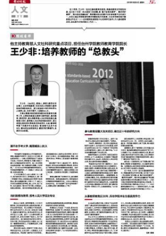 日前,《台州晚报》“院校名师”栏目以《王少非:培养教师的“总教头”》为题,整版报道我校教师教育学院院长王少非教授。文章采用写实的手法,介绍了王少非教授的求学、从教和学术研究等内容。