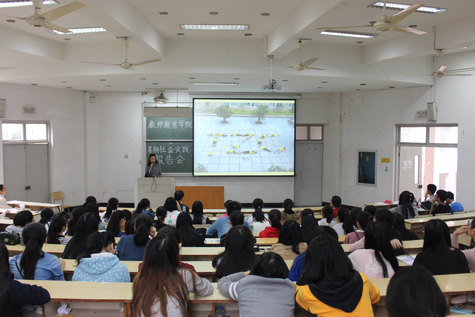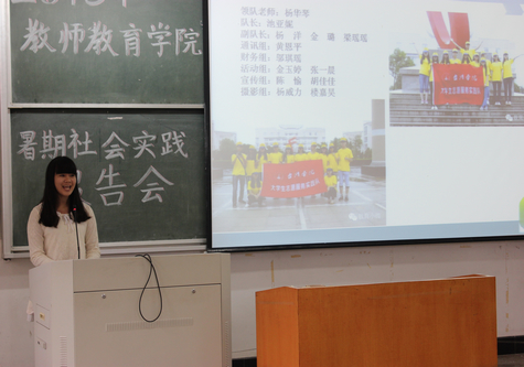 报告会上,各实践队代表通过精美的PPT,就实践主题、活动内容、取得的成果及实践经验等方面进行交流分享。2015年暑期社会实践,教师教育学院结合专业特色,组建了三支各具特色的实践团队。实践队秉承教育为先理念,走进小学校园,开设了具有地方特色的课程。成员们在实践中勤奋学习,积极备课,将许多专业理论应用于课堂,为当地的小学生带来别具特色的精彩课程。
