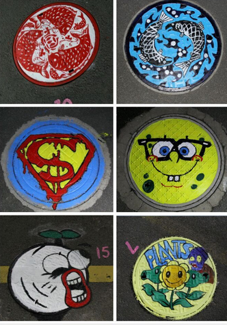 原本灰蒙蒙的普通井盖变成了华丽丽的艺术品。剪纸画“红鲤鱼”、叮当猫“多啦A梦”、植物大战僵尸“豌豆射手”、神奇宝贝“皮卡丘”等井盖设计美术作品让人耳目一新,极具创意的井盖成为校园内一道独特的风景。据了解,机械学院主办此次井盖设计大赛,从9月份开始面向全校学生征集设计作品,共吸引了校内100多名同学参与,征集到以小组为单位的井盖设计图稿48件。最后评选出12优秀作品,分别获得一二三等奖。