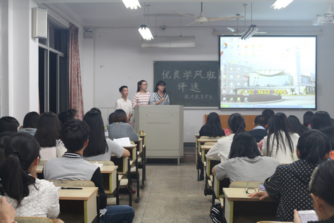 10月15日晚,教师教育学院举办2014学年优良学风班评比活动。学院党总支书记金台政、副院长粟高燕、副书记鲍婷婷及学辅导员老师等出席并担任评委,各班级学生代表作为大众评委参加评选活动。