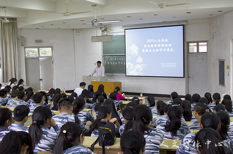 10月8日下午,人文学院2015级新生趣味游园活动暨新生文体节开幕式在A3大教室举行。学院党总支副书记吴世永致辞,辅导员、新生班主任出席,学院全体新生统一穿着迷彩服参加。