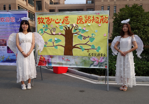 在学校门口,由医学院学生组成的、被称为“小天使”的迎新礼仪队,身着洁白护士服热情接待新生及家长,成为了校园一道亮丽的风景线。在报到处,迎新师生工作认真仔细,竭诚为新生做好各项服务,消除了新生们初来乍到的陌生感,也使家长们倍感放心。此外,还有精心设计的心愿墙供新生们在大学伊始写下心愿,放飞梦想。