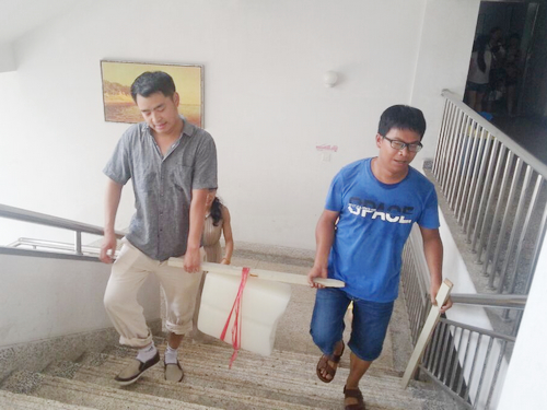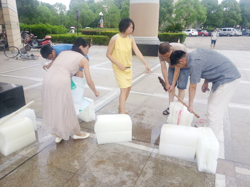 尽管今天天气非常炎热,但人文学院的学生和监考老师们都忍受着高温,认真地考试、监考。学院的教务、学工、行政的老师们看在眼里,急在心头。为了改善考场条件,他们主动联系制冰厂,订购了9大块100多斤冰块。制冰厂将冰块送来后,吴世永、阮成坚、俞桂红、张秋芬、王进利、张宗岩等老师和几位学生又自己动手,把冰块一一搬运到学院的9个考场,为师生们送去清凉。