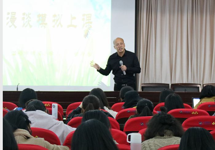 讲座中,颜寿春老师分析了模拟上课与真实上课、模拟上课与说课的区别,介绍了有效可行的教学方法与技巧,并通过现场模拟上课强调注重“生本课堂”、课堂围绕学生进行的重要性。他希望同学们多学习、敢创新、善反思,脚踏实地,不断丰富自己、超越自己。讲座理论联系实践,既有宏观的方法指导,又有微观的典型案例分析,具有和很强的感染力和启发性。