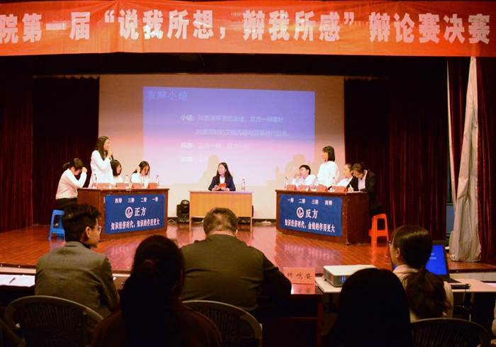 经过初赛、复赛的选拔,由17国贸、18国贸组成的正方队和17旅管、18金融组成的反方队最终会师决赛现场,双方围绕“知识经济时代,知识/金钱的作用更大”的辩题展开了激烈角逐。辩手唇枪舌战、针尖对麦芒,不断将辩论氛围推向高潮。最终,反方队伍凭借出色的反应能力和严谨的逻辑夺得本届辩论赛的冠军;正方四辩许慧瑶同学摘得最佳辩手的称号。