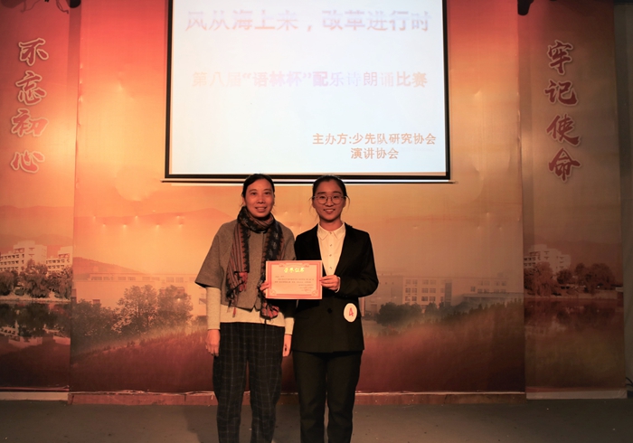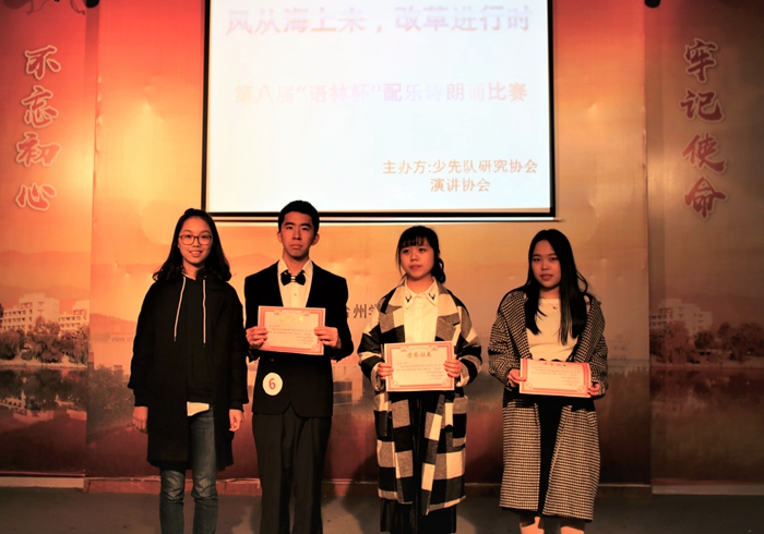 第一环节个人朗诵,十位选手轮流展现出各自的朗诵才能,4号选手钱彦吉以满腔热忱演绎了《回答》中的直面挑战改革开放精神;6号选手林一超带来原创诗歌《天地炎黄》,彰显炎黄子孙的民族自豪感。18学前2班葛弘仪同学作为嘉宾助演带来古筝曲《瑶族舞曲》,抑扬顿挫的乐声宛转悠扬。第二环节搭档朗诵,选手们默契的配合以及激情澎湃的朗诵将比赛推向高潮。;18小教2班的张怡同学的一曲《岁月神偷》,以娓娓动听的歌声活跃了氛围。最后个人讲演环节旨在考验着选手们的即兴讲演能力,各位选手言辞流利,展现深厚的语言功底。评委们依次对参赛选手进行点评,针对语音、语气、仪表仪态等方面提出意见,使与会同学受益匪浅。最终,来自17中教3班钱彦吉同学摘得桂冠。