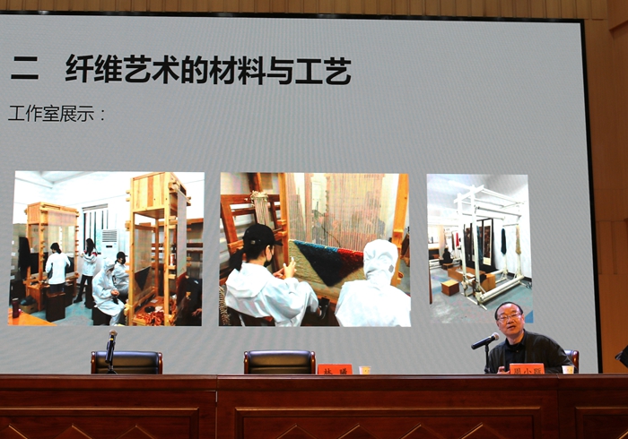 周小瓯教授在“现代纤维艺术鉴赏”讲座中,从纤维艺术的发展历程出发,介绍了世界有名的纤维艺术家,展示并讲解了世界经典纤维艺术作品,将师生带入纤维艺术的殿堂,同时结合自己的作品阐述自己对纤维艺术的认识与理解,将深奥的艺术知识变得通俗易懂,让人感受世界粗糙却有生命的朴实,简单却有自然的气息,柔软并洋溢着人性的温暖。