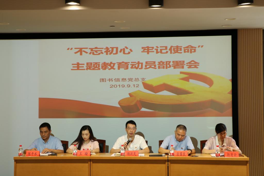 9月12日上午,图书信息党总支在图书馆六楼影音阅览室召开“不忘初心、牢记使命”主题教育动员部署会。会议由党总支书记杨跃民主持,总支全体党员和部分教职工代表参会,校“不忘初心、牢记使命”主题教育巡回指导组王瑜出席.