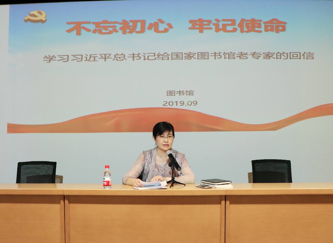 9月20日上午,校图书信息党总支第一支部召开专题学习会,组织学习《习近平给国家图书馆老专家回信》,把学习贯彻落实回信精神作为“不忘初心、牢记使命”主题教育的重要抓手。校图书馆副馆长、图书信息党总支第一党支部书记杨凌云全文传达习近平总书记的回信并作主旨发言,图书馆全体馆员参加学习会。