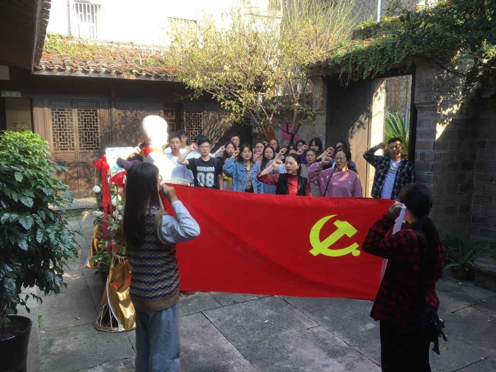 革命先烈郭凤韶的故居就坐落在古街之中,故居院内郭凤韶烈士的塑像正气凛然。讲解员向同学们详细地讲述了郭凤韶烈士的一生概况,组织观看了讲述郭凤韶烈士事迹的《雨花台》《永远的丰碑》等电影片段。郭凤韶烈士视革命为第一生命,早已将自己的生死置之度外,党员们对郭凤韶烈士的敬仰之情油然而生;郭凤韶奋不顾身、大义凛然和英勇无畏,犹如她所作的《且向百花头上开》红梅图,冷艳且香、傲气坚强。活动中,学生党支部书记带领大家面向党旗庄重宣誓,在烈士故居重温申请入党时的思想激情和奋斗追求,不忘初心、牢记使命。