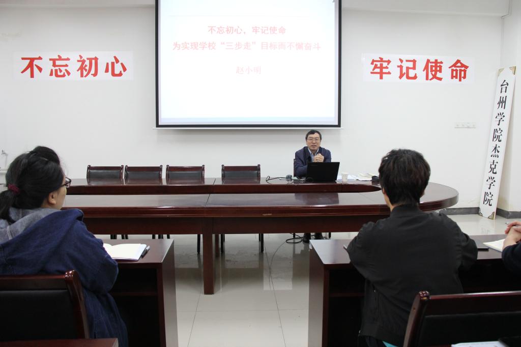 赵小明以《不忘初心,牢记使命 为实现学校“三步走”目标而不懈奋斗》为题,结合自己的学习体会从十二个方面深刻剖析习近平新时代中国特色社会主义思想的精神实质和丰富内涵。联系校第三次党代会主题以及具体目标,诠释台州学院初心使命的具体体现是“为党育人、为国育才”,办好人民满意的大学;台州学院人的初心使命是落实立德树人根本任务,建设国内一流、国际上有良好声誉的高水平应用型大学,办好台州人民满意的大学。