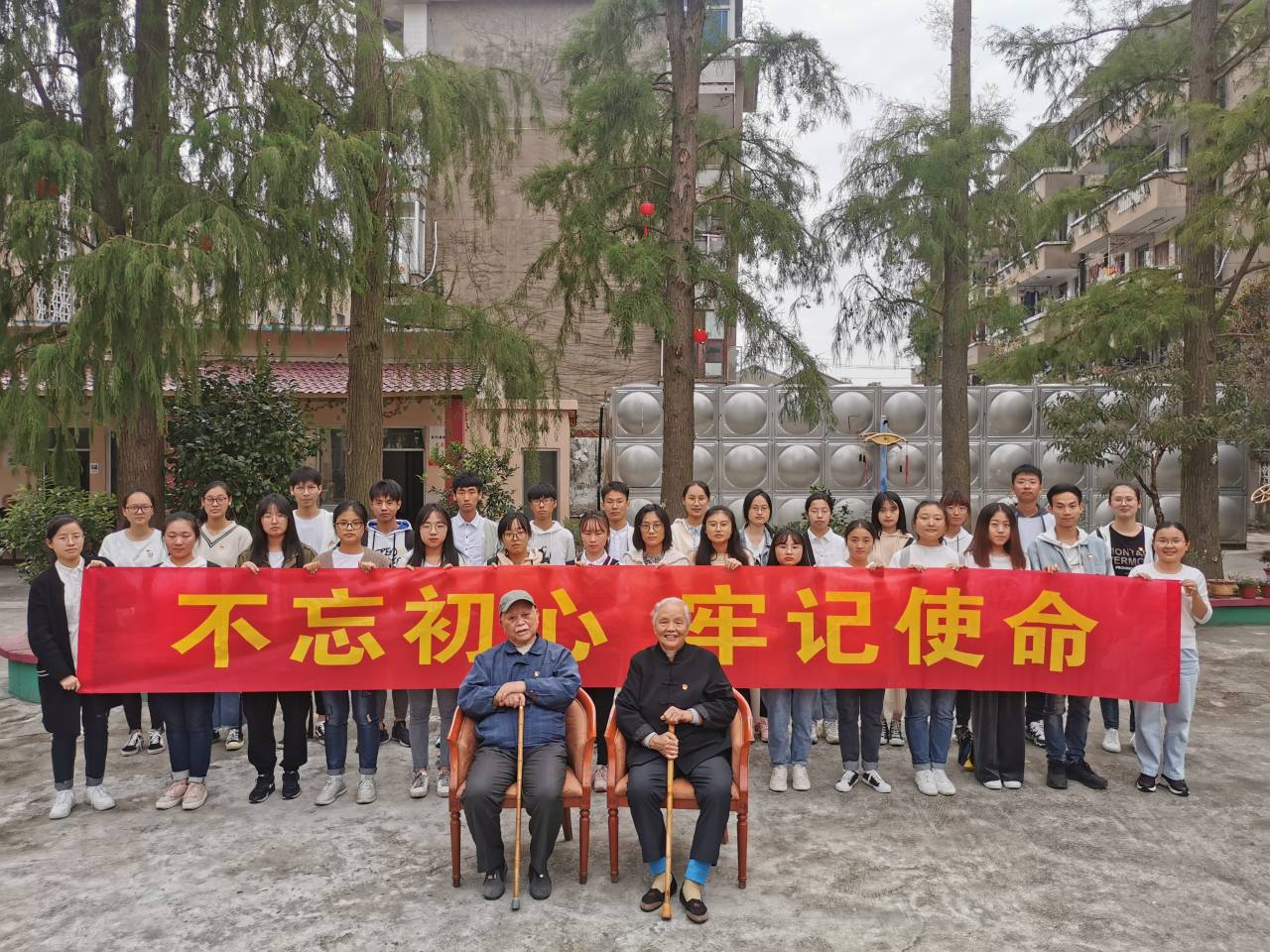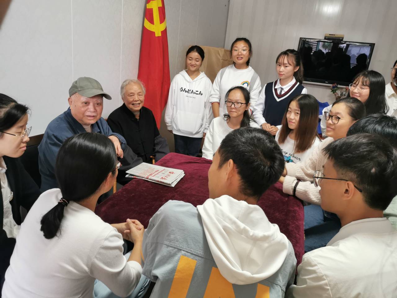 活动过程中还专门邀请托老院张少秋、吴彩凤两位老党员为大家上“党课”。正值耄耋之年的他们,对同学们的到来表示非常的激动,愉快地讲述起他们所经历的那段跌宕起伏的从军岁月。张少秋1950年入伍,曾参加过抗美援朝、西藏平叛等战役,当时行军环境恶劣,非常艰苦,他多次死里逃生令同学们动容。他俩是革命战友结识,吴彩凤跟随他从抗美援朝到山西大同再到西安、宝鸡、甘肃一共走了7、8年,他们无怨无悔,一心为祖国效力的赤诚之心尽显一名共产党员的使命与担当。他们理想信念坚定,如今仍心系国家大事,密切关注国家建设,只要身体状况允许,都会参加党支部每月一次的组织生活会。吴彩凤还拿出了他们在重复多遍观看70周年阅兵仪式后,以及阅读十九大、十九届四中全会等报刊新闻所摘录的笔记,一架架飞机、一辆辆坦克、一艘艘航母,都是国富民强的最好注解。他们在话语间更是充满对国家的繁荣富强欣慰不已,并殷切希望和嘱托大家要学好文化知识,投身建设美好的祖国。同时他俩还专门佩戴上珍藏的党徽与同学们合影留念。