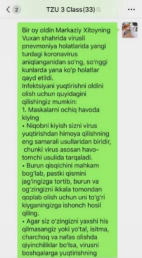形成共识后马上开展行动。辅导员们冲在最前头,先精挑细选一些容易理解和记忆的防控知识点,由龚清枫全部翻译成英语,发送给看得懂英语的国际生。同时也将翻译内容发送给校内的俄语、韩语等教师,请求支援,帮忙翻译。剩下的那些乌兹别克语,他们就只能硬着头皮,和一些学生代表合作,通过网络在线翻译,再与英语、汉语对比矫正,翻译成大家需要的语言。