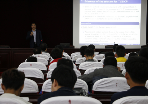 凌晨教授主要从事非线性规划、变分不等式与互补问题、多变量多项式优化、多目标优化理论与应用等研究工作,曾主持多项国家自然科学基金及省自然科学基金重点项目,一批成果在国际运筹学领域顶级学术期刊上发表。在题为《高阶张量特征值互补问题理论与算法》专题讲座中,凌教授从简单的矩阵特征值入手,引出一类新的张量互补问题——张量特征值互补问题,并通过丰富贴切的实例具体阐述了张量特征值的性质,讨论了求解张量特征值问题的有效算法。