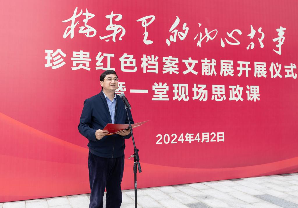 朱坚为活动致辞。他表示,“档案里的初心故事——珍贵红色档案文献展”展馆的落成,是增强党史工作思想引领力、教育感召力、咨政服务力的有力举措,是践行“澡身浴德 修业及时”校训精神的生动实践,更是学校拓展思想政治教育新阵地的不懈探索。对于下阶段的工作,他强调要充分发挥展馆群一体化育人实效,将红色展馆打造成学生思政课现场教学的重要阵地并实现全覆盖,创造性地把红色资源转化为思政教育资源。要抓好讲解员队伍建设,让讲解员不仅讲好中华民族、中国共产党、中华人民共和国、中国特色社会主义的大故事,也要讲好浙江故事、台州故事、台州学院故事,推动全校红色文化学习走深走实。要持续扩大红色文化的社会辐射力,不断加强地方文化研究阐释,聚焦科研平台建设,加强高层次宣传文化人才引育,以先进文化力支撑高质量发展之路,推动精品文化向地方辐射。