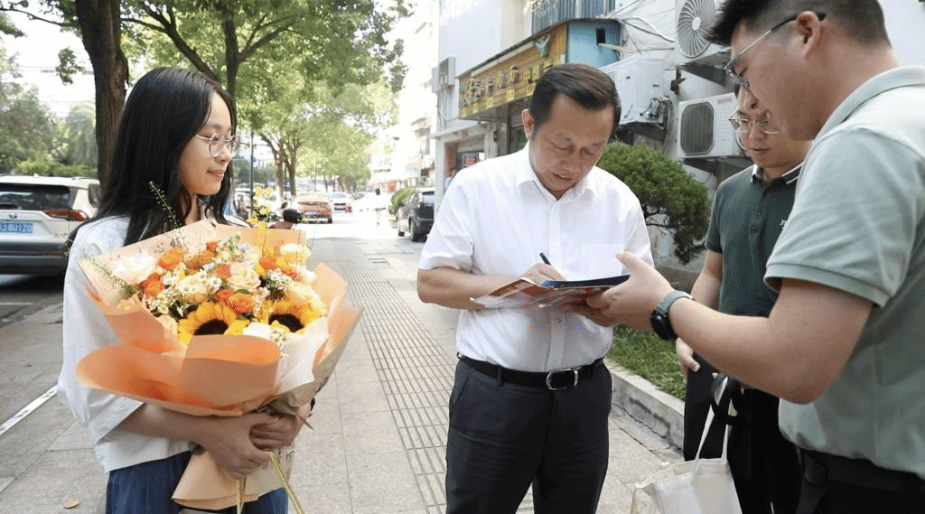 晴川日烈,岁月含香。7月17日下午,台州学院校长、党委副书记乐传永,副校长、党委委员李建军赶赴玉环,亲手将2024年第一批录取通知书送到陈鎣榆、郑楚愉两位新生的手中。玉环市副市长方安平全程陪同。