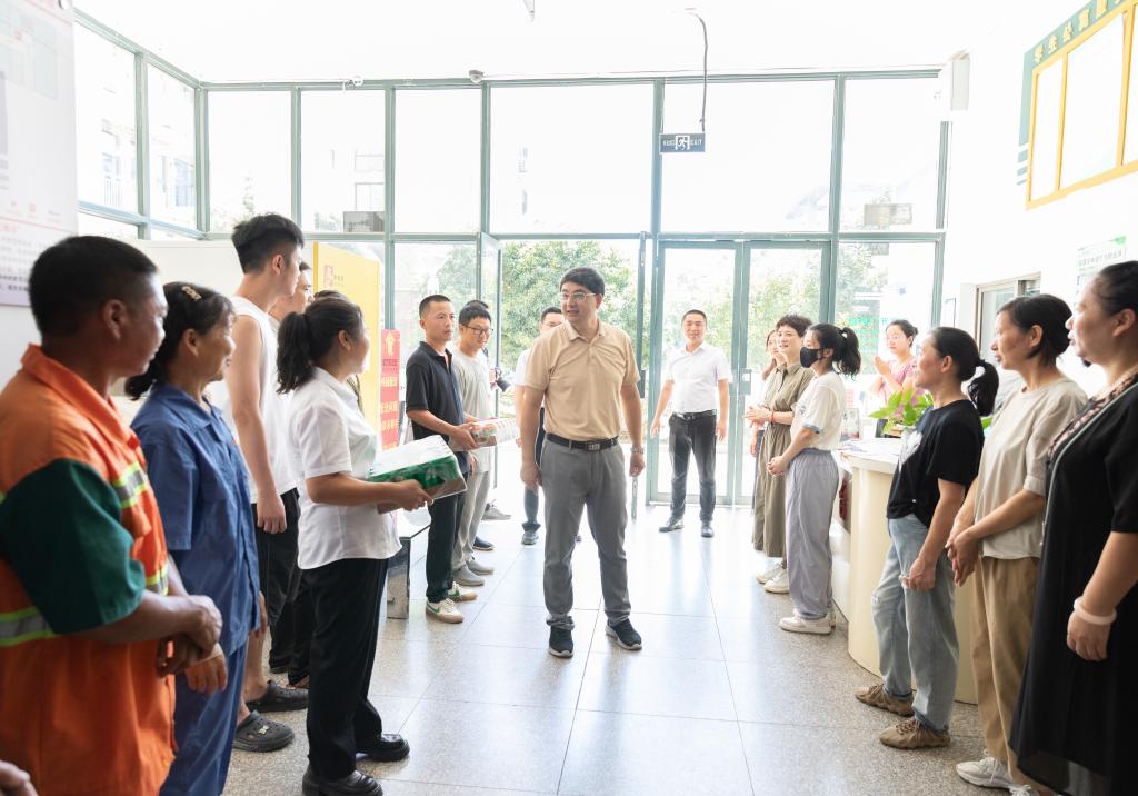 8月1日,校党委书记朱坚深入椒江、临海两校区,看望慰问暑期坚守岗位的工作人员和留校学生,为他们送去清凉和关怀。