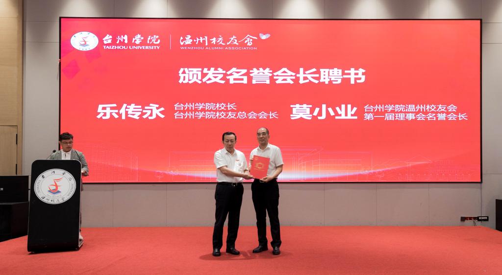 乐传永为台州学院温州校友会第一届理事会名誉会长、温州市台州商会会长莫小业和台州学院温州校友会第一届理事会会长、红蕃茄教育集团董事长、2007届校友方双庆颁发聘书。