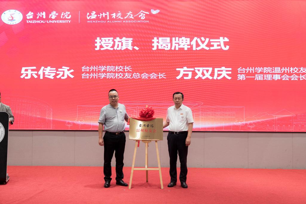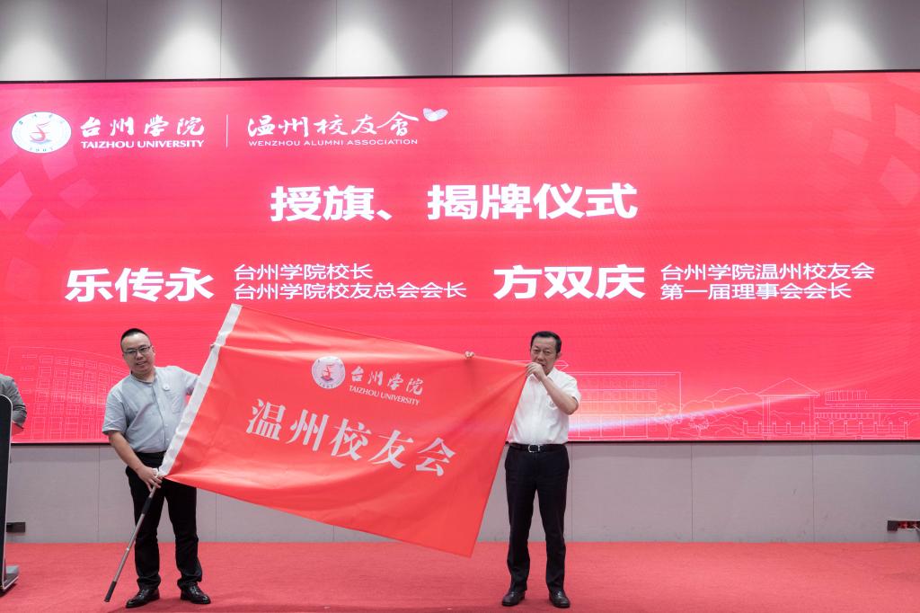 乐传永向台州学院温州校友会第一届理事会会长方双庆授旗,并进行揭牌仪式。