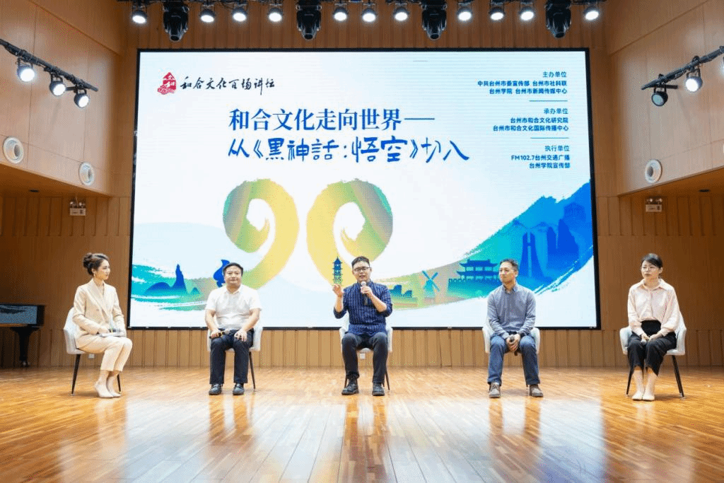 10月17日晚,第49期和合文化百场讲坛在台州学院椒江校区音乐厅隆重举行。本次活动由中共台州市委宣传部、台州市社科联、台州学院和台州市新闻传媒中心联合主办,台州学院宣传部、人文社科处协助承办。活动以现象级国产游戏《黑神话:悟空》为切入点,多角度探讨和合文化迈向世界的全新机遇,主讲嘉宾均为台州学院和合文化团队核心成员。台州学院党委委员、纪委书记楼胆群,副校长、党委委员李建军,台州市委宣传部副部长李羚,台州市社科联副主席汤天伟,台州市传媒集团有限公司副董事长黄保才,台州市新闻传媒中心(集团)副主任李卫国,校党委委员、宣传部部长蔡海江,校党委委员、人事处处长郑丽君,以及学校有关部门、学院、科研机构负责人出席活动。300多名师生代表现场聆听精彩讲解。活动由台州市新闻传媒中心主持人张艺主持。