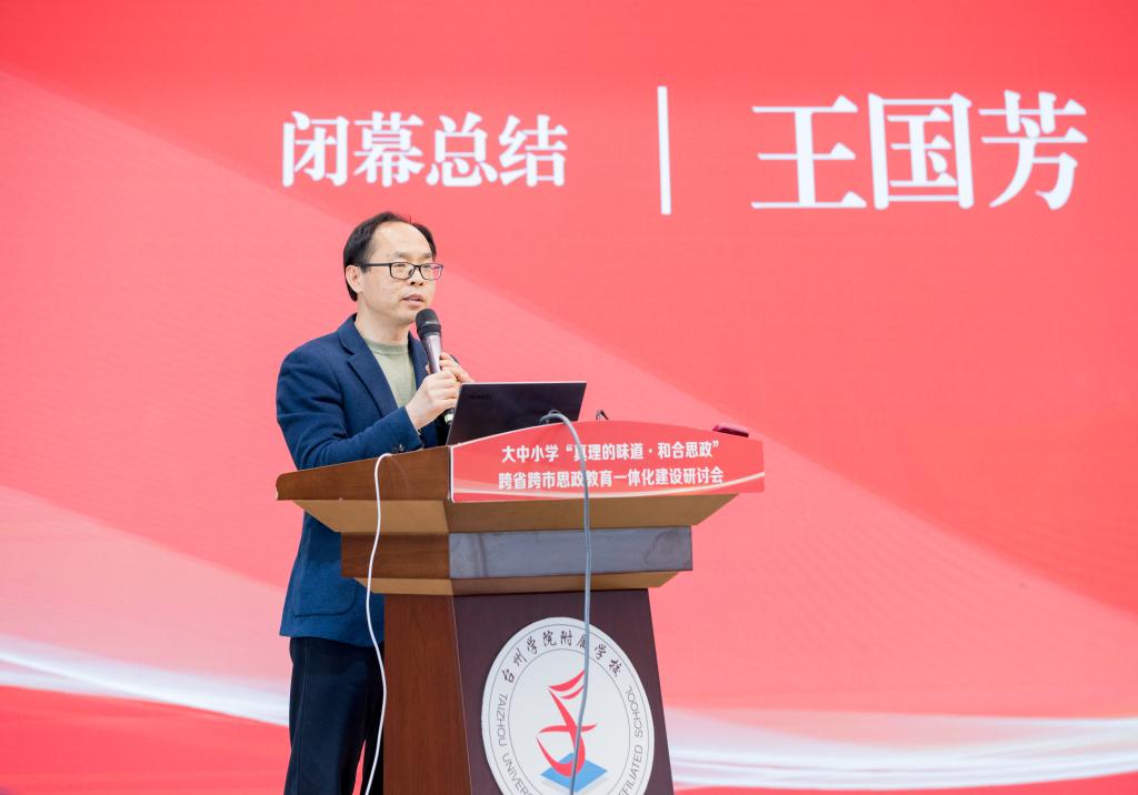 闭幕式上,浙江省教育厅教研室教研员王国芳作总结讲话。他指出,“和合思政”既有鲜明的台州特色,也蕴含着深厚的中华优秀传统文化,是智慧、理念,也是方法论。他认为,推进“真理的味道”的地方实践,要突出地方味、创新味和思政味,要进一步凝练特色,提升思政教育一体化建设水平,打造浙江思政教育品牌。