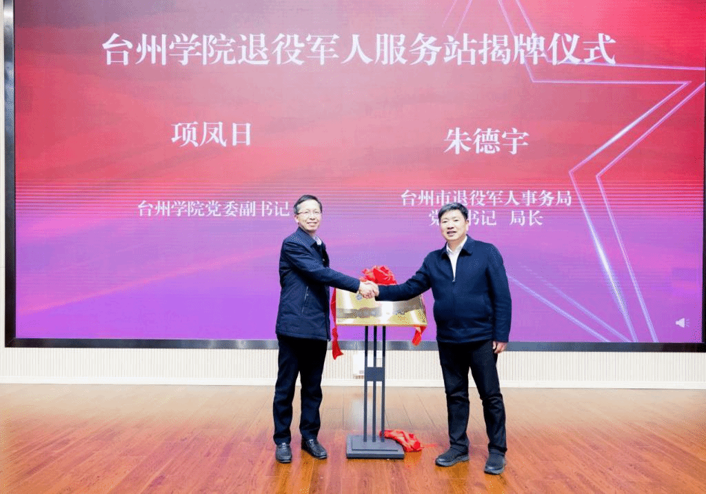 台州市退役军人事务局党组书记、局长朱德宇,台州学院党委副书记项凤日共同为“台州学院退役军人服务站”揭牌,标志着校地协同服务退役军人工作迈入新阶段。