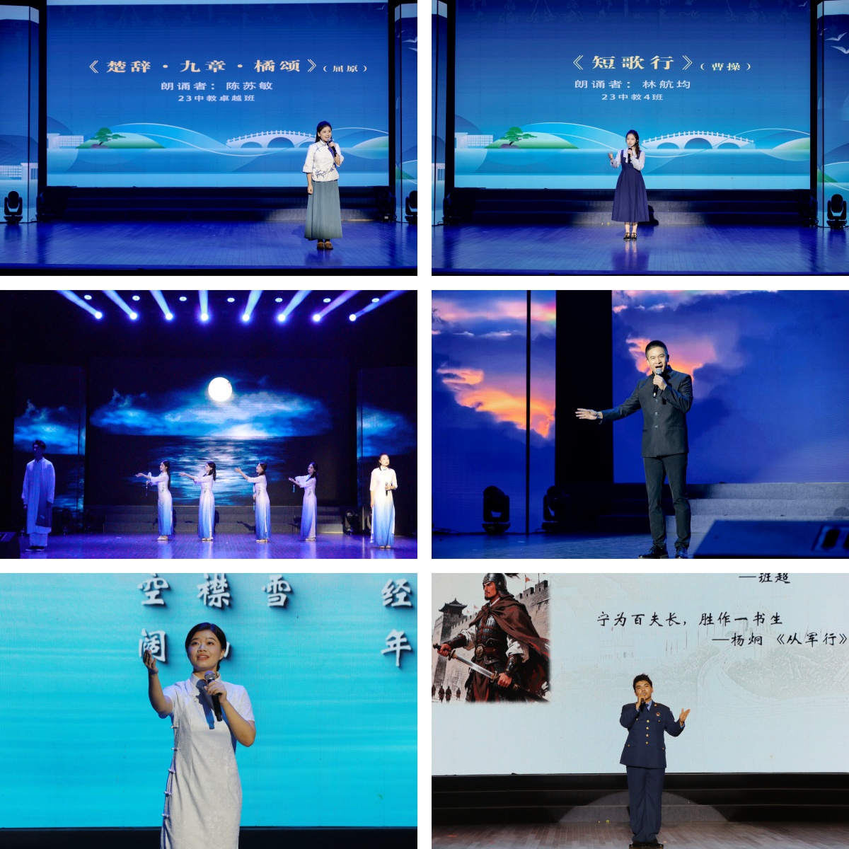 整场诵读会分为“永恒的经典”与“永续的精神”两大篇章。诵者们以声音为媒,以情感为舟,让沉睡的文字焕发新生。在第一篇章“永恒的经典”中,我校浙江省中华经典诵读竞赛获奖选手率先登场,吟诵声起,从《庄子·秋水》的哲思浩渺,到《贺新郎》的慷慨沉郁,句句动人。随后,厉彦彤、杨威等同学带来的《春江花月夜》,以清越之声勾勒出春江潮涌、月照花林的空灵意境。李鉴兵老师朗诵的《梦游天姥吟留别》,气势磅礴,将诗人李白的超然与不羁展现得淋漓尽致。陈诺与章晨辉同学则分别解读《念奴娇·过洞庭》与《破阵子·为陈同甫赋壮词以寄之》,在铿锵语调中传递出古典词章中的豪情与抱负。台州学院附中张琳达与应皓宇老师合作演绎的《晨钟之使命》,声音坚定,情感饱满,展现了教育工作者传承文明的初心与担当。