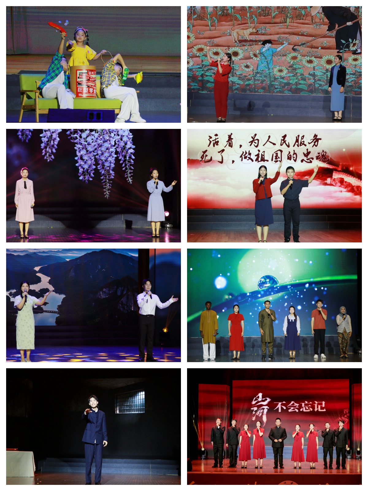 第二篇章“永续的精神”在台州学院附中语之林社团朗诵的《呼兰河传》选段中拉开帷幕,叶子萱、林晨同学的声音中尽显北国风土与人情温度。陈子莹与班后璇同学演绎的《紫藤萝瀑布》,让观众在朗朗诵读声中感受生命的蓬勃与哲思。人文学院校友李之韵、王淇仟带来的《我的南方和北方》,声情并茂,勾勒出祖国山河的壮阔与文化的多元。随后,语之林社团再度登台,顾珞凡、杨辰宇同学以《红岩魂》展现革命先烈的坚定信仰,声声铿锵,震撼人心。林航均等同学与留学生比拉尔等人合作朗诵《青春万岁》,跨越语言与文化,共诵青春的理想与激情。郭逸濠同学演绎的《我用残损的手掌》,深沉而有力,传递出对家国的深挚眷恋。最后,李鑫老师与唐茜蓓等同学共同呈现的《山河不会忘记》,将全场气氛推向高潮。时值中国人民抗日战争暨世界反法西斯战争胜利八十周年,演出以铿锵的语言致敬历史,表达了对英雄的深切缅怀与对和平的珍视。