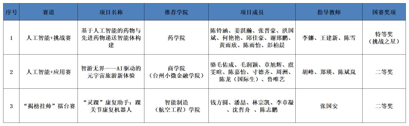 今年我校在浙江省“挑战杯”大学生课外学术科技作品竞赛中获1金7银20铜的历史最好成绩。4支项目团队入围全国总决赛,3支项目团队入围全国总决赛现场赛,入围全国总决赛、现场赛项目数量均为历年之最。其中药学院李娜、王建新、陈雪老师指导的《基于人工智能的药物与先进药物递送智能体构建》项目获“人工智能+”挑战赛特等奖并获第1名,成为该赛道“擂主”挑战之星,我校成为获国赛“擂主”的唯一一所地方高校;商学院胡峰、郑瑛、陈斌岚老师指导的《智游无界——AI驱动的元宇宙旅游新体验》项目获“人工智能+”应用赛二等奖;智能制造学院张国安老师指导的《“灵踝”康复助手:踝关节康复机器人》项目获“揭榜挂帅”擂台赛二等奖;人工智能学院郭文平、王丹丹、金杰老师指导的《“杏林智诊”——基于多模态融合的中医专病临床智能辅助诊疗大模型》项目入围国赛现场赛。