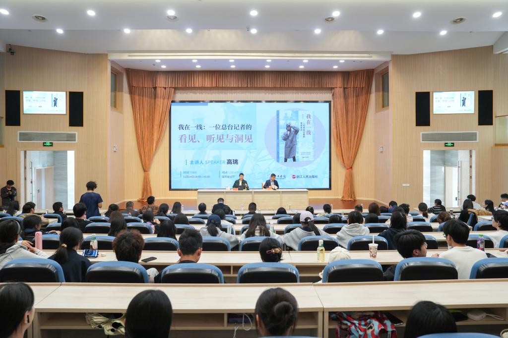 11月14日,中央广播电视总台浙江总站总编室常务副总编辑、第十四届全国青联委员、第十二届浙江省青联常委高珧应学校党委宣传部邀请莅临我校国际会议厅作题为《我在一线:一位总台记者的看见、听见与洞见》新闻宣传的专题讲座。校党委委员、宣传部(教师工作部)部长蔡海江主持。全校各二级学院、职能部门宣传员教师,人文学院网络与新媒体专业学生,校融媒体中心、校团委新闻中心、商学院团学会新媒体中心学生记者等170余人参加听讲。