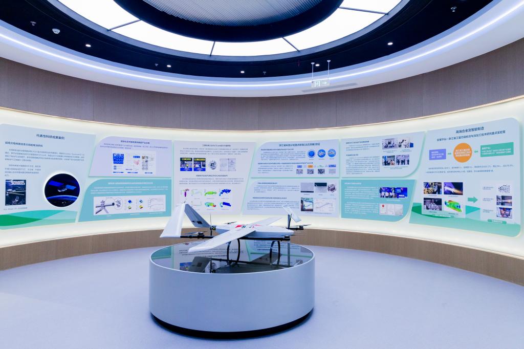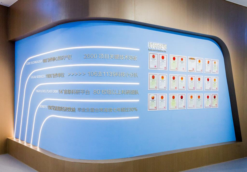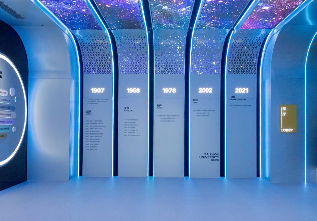 据悉,台州学院高水平应用型大学建设成果展厅占地800多平方米,总体上按照“总-分-总”模式设计,并从台州山海兼得的地理环境与天台山和合文化中汲取养分,将天圆地方、刚柔相济等我国传统文化理念融入造型与平面设计,将版面色调与展陈内容进行匹配。展厅内容上打破学院壁垒,综合学校学科专业集群及服务的领域,分为医药化工、高端制造、新材料与新能源、生命与健康、生态环保、建筑工程、人工智能、人文与社会等八大主题进行布展,采取“序厅+概览厅+主题厅+尾厅”的布局构架,每个主题厅采取“概要+方向模块”的布局,一个模块为一个科研主攻方向或服务的具体领域,每个模块之下整合了平台、案例、成果、育人等内容,形成了体系完整、层次清晰、结构严密的展陈格局。展厅集中呈现学校近年来在践行“办好一所大学,繁荣一座城市”办学使命,推进校城共生发展、教育科技人才一体化改革,建设高水平应用型大学方面所取得的显著成就。