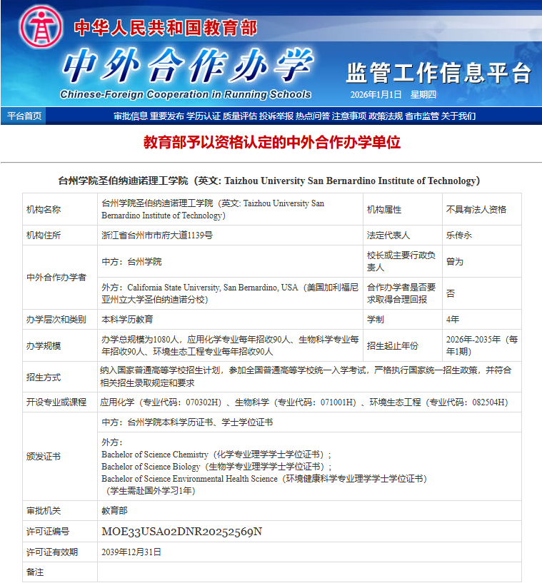 2025年12月31日,教育部中外合作办学监管工作信息平台公布最新一批获资格认定的中外合作办学单位。我校与美国加州州立大学圣伯纳迪诺分校合作举办的“台州学院圣伯纳迪诺理工学院”正式获批设立(许可证编号:MOE33USA02DNR20252569N),标志着学校在国际交流与合作领域实现重大突破,国际化办学迈入新阶段。