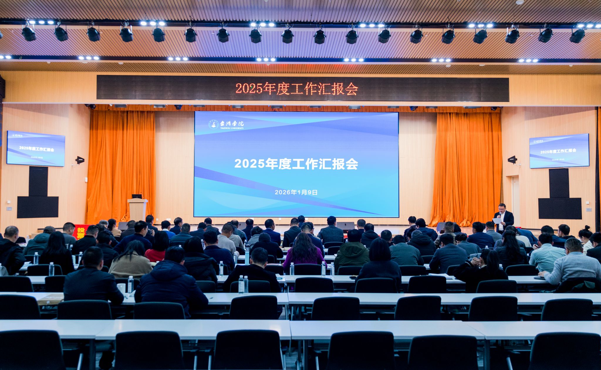 1月9日,学校在椒江校区科技综合楼三楼学术报告厅召开2025年度工作汇报会。校党委书记朱坚,校长、党委副书记乐传永等学校党政领导班子成员出席。校党委副书记丁一志主持会议。中层干部、校教学督导、教师代表、各二级党组织负责人、党建联系人等参加会议。