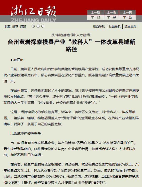 在台州黄岩,这条新闻激起了不小的波澜。浙江凯华模具有限公司副总经理李过在朋友圈转发时配文:“等了这么多年,终于有了家门口的工程师‘黄埔军校’。”一位正在产业学院就读的大三学生留言:“还没毕业,已经有两家企业来‘预定’了。”
