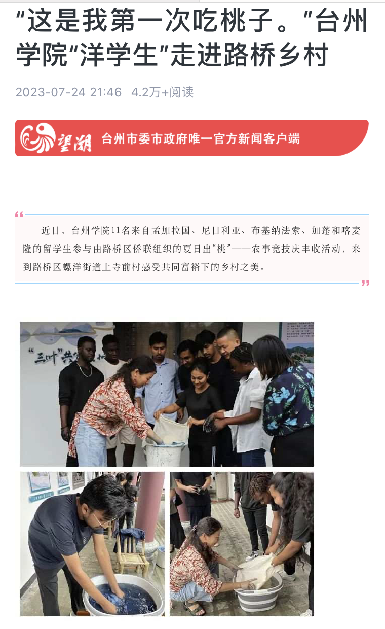 近日,台州学院11名来自孟加拉国、尼日利亚、布基纳法索、加蓬和喀麦隆的留学生参与由路桥区侨联组织的夏日出“桃”——农事竞技庆丰收活动,来到路桥区螺洋街道上寺前村感受共同富裕下的乡村之美。