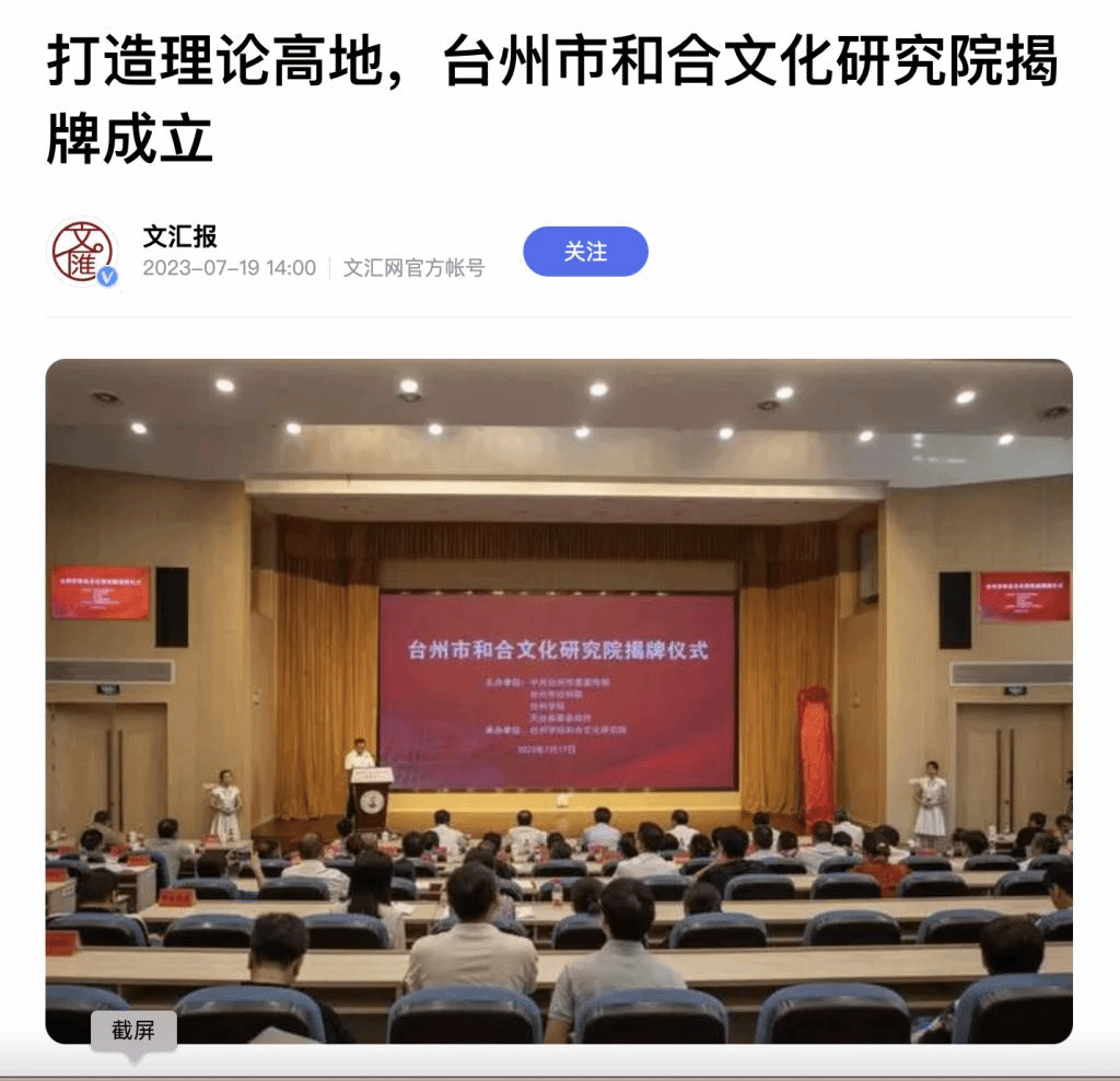 近日,由台州市委宣传部、市社科联和台州学院共同发起的台州市和合文化研究院在台州学院椒江校区揭牌。这是一个以台州学院和合文化研究院为基础,市校共建的集学术研究、文化传承、理论创新为一体的重要研究平台。