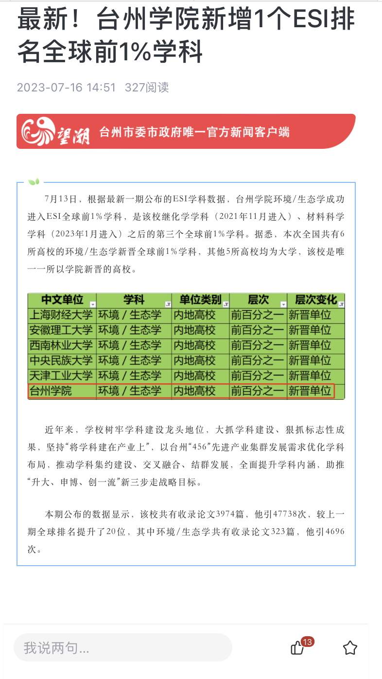 7月13日,根据最新一期公布的ESI学科数据,台州学院环境/生态学成功进入ESI全球前1%学科,是该校继化学学科(2021年11月进入)、材料科学学科(2023年1月进入)之后的第三个全球前1%学科。据悉,本次全国共有6所高校的环境/生态学新晋全球前1%学科,其他5所高校均为大学,该校是唯一一所以学院新晋的高校。