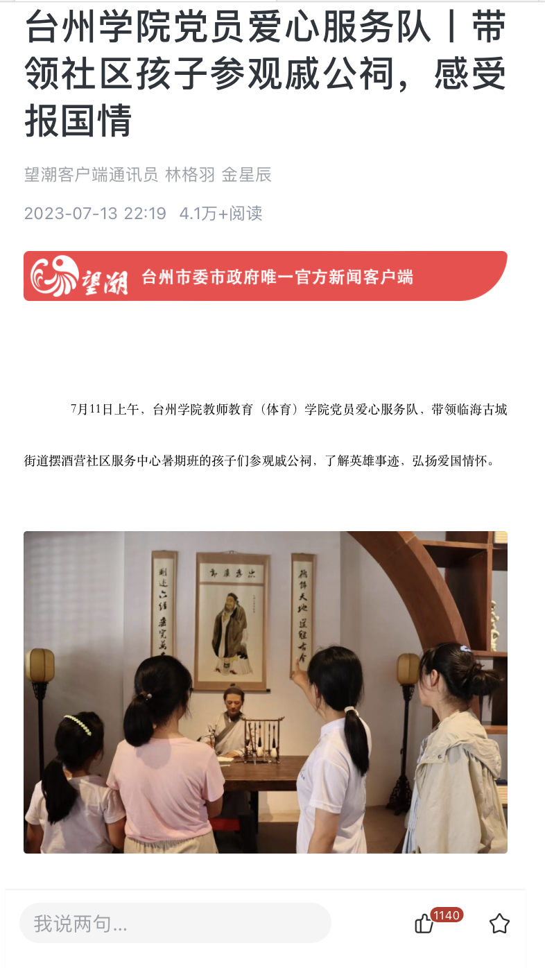 7月11日上午,台州学院教师教育(体育)学院党员爱心服务队,带领临海古城街道摆酒营社区服务中心暑期班的孩子们参观戚公祠,了解英雄事迹,弘扬爱国情怀。