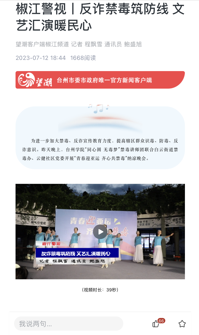 为进一步加大禁毒、反诈宣传教育力度,提高辖区群众识毒、防毒、反诈意识。昨天晚上,台州学院“同心圆 无毒梦”禁毒讲师团联合白云街道禁毒办、云健社区党委开展“青春迎亚运 齐心共禁毒”纳凉晚会。