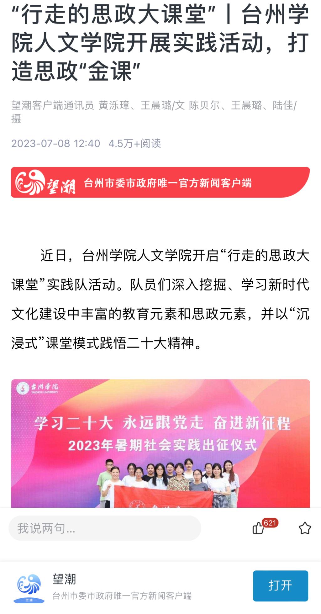 近日,台州学院人文学院开启“行走的思政大课堂”实践队活动。队员们深入挖掘、学习新时代文化建设中丰富的教育元素和思政元素,并以“沉浸式”课堂模式践悟二十大精神。