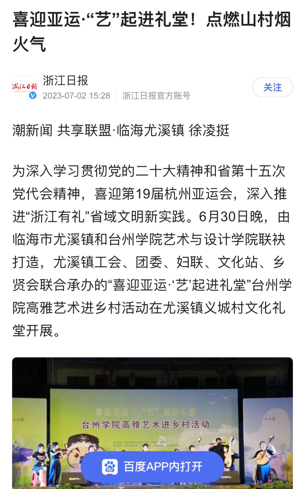 为深入学习贯彻党的二十大精神和省第十五次党代会精神,喜迎第19届杭州亚运会,深入推进“浙江有礼”省域文明新实践。6月30日晚,由临海市尤溪镇和台州学院艺术与设计学院联袂打造,尤溪镇工会、团委、妇联、文化站、乡贤会联合承办的“喜迎亚运·‘艺’起进礼堂”台州学院高雅艺术进乡村活动在尤溪镇义城村文化礼堂开展。