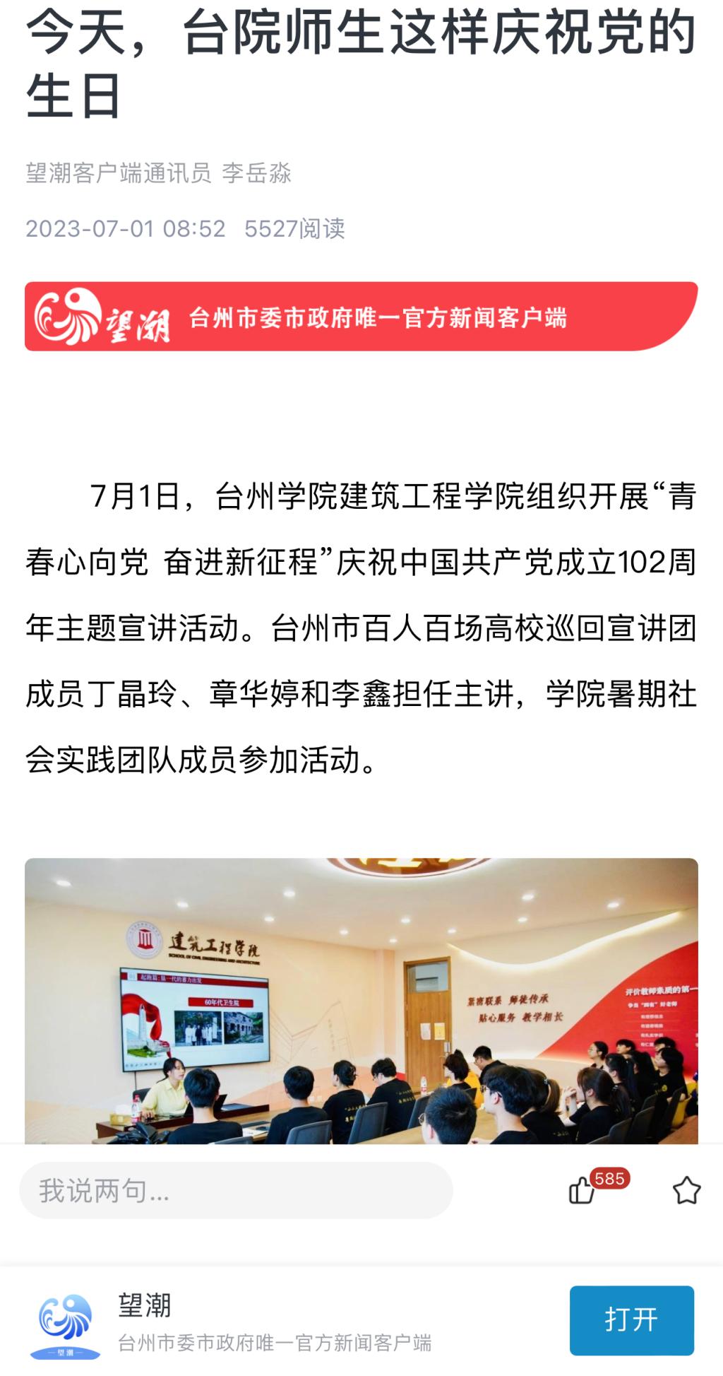 7月1日,台州学院建筑工程学院组织开展“青春心向党 奋进新征程”庆祝中国共产党成立102周年主题宣讲活动。台州市百人百场高校巡回宣讲团成员丁晶玲、章华婷和李鑫担任主讲,学院暑期社会实践团队成员参加活动。