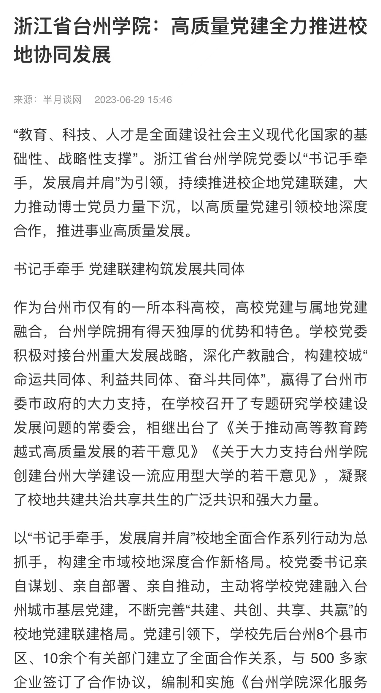 “教育、科技、人才是全面建设社会主义现代化国家的基础性、战略性支撑”。浙江省台州学院党委以“书记手牵手,发展肩并肩”为引领,持续推进校企地党建联建,大力推动博士党员力量下沉,以高质量党建引领校地深度合作,推进事业高质量发展。