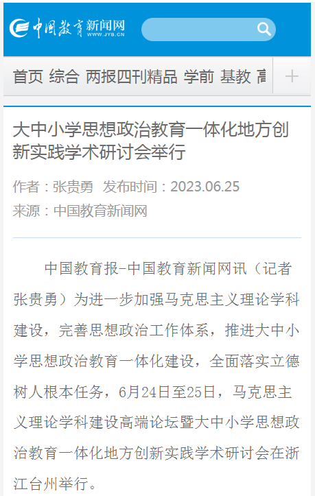 为进一步加强马克思主义理论学科建设,完善思想政治工作体系,推进大中小学思想政治教育一体化建设,全面落实立德树人根本任务,6月24日至25日,马克思主义理论学科建设高端论坛暨大中小学思想政治教育一体化地方创新实践学术研讨会在浙江台州举行。