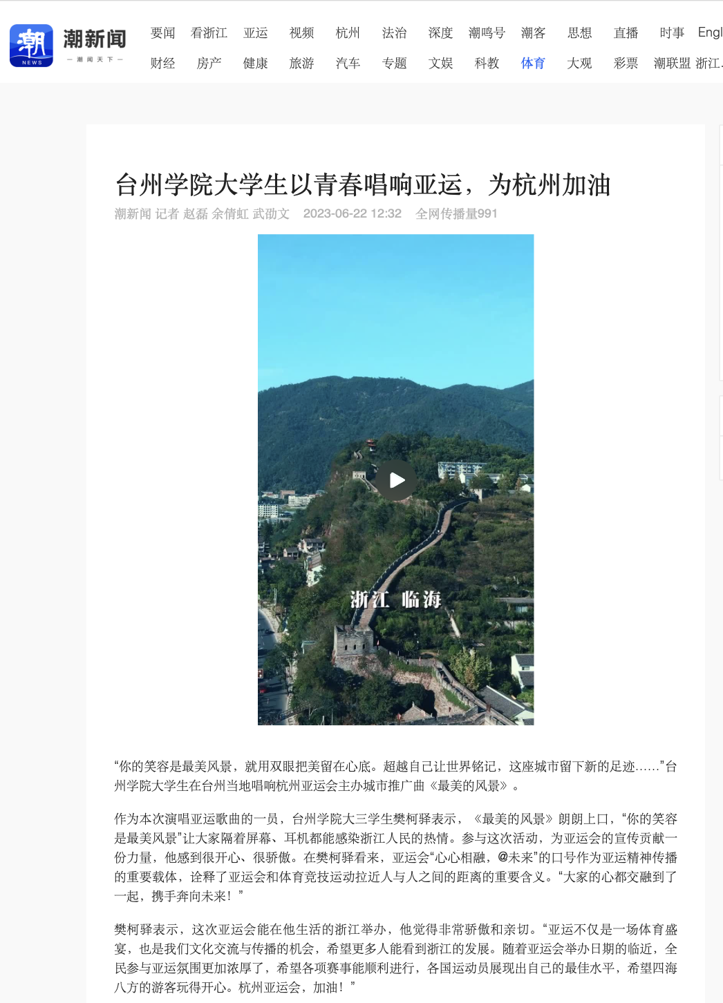 “你的笑容是最美风景,就用双眼把美留在心底。超越自己让世界铭记,这座城市留下新的足迹……”台州学院大学生在台州当地唱响杭州亚运会主办城市推广曲《最美的风景》。