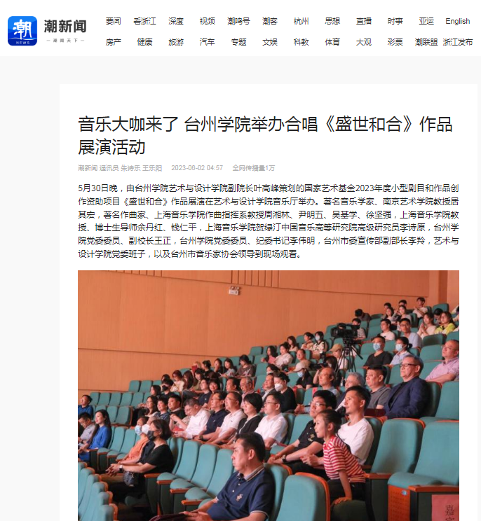 5月30日晚,由台州学院艺术与设计学院副院长叶高峰策划的国家艺术基金2023年度小型剧目和作品创作资助项目《盛世和合》作品展演在艺术与设计学院音乐厅举办。著名音乐学家、南京艺术学院教授居其宏,著名作曲家、上海音乐学院作曲指挥系教授周湘林、尹明五、吴基学、徐坚强,上海音乐学院教授、博士生导师余丹红、钱仁平,上海音乐学院贺绿汀中国音乐高等研究院高级研究员李诗原,台州学院党委委员、副校长王正,台州学院党委委员、纪委书记李伟明,台州市委宣传部副部长李羚,艺术与设计学院党委班子,以及台州市音乐家协会领导到现场观看。