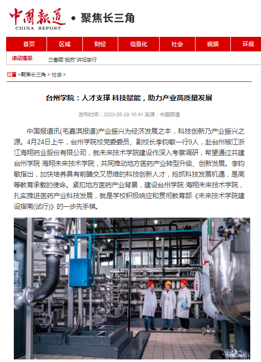 产业振兴为经济发展之本,科技创新乃产业振兴之源。4月24日上午,台州学院校党委委员、副校长李钧敏一行9人,赴台州椒江浙江海翔药业股份有限公司,就未来技术学院建设作深入考察调研,希望通过共建台州学院·海翔未来技术学院,共同推动地方医药产业转型升级、创新发展。李钧敏指出,加快培养具有前瞻交叉思维的科技创新人才,抢抓科技发展机遇,是高等教育承载的使命。紧扣地方医药产业背景,建设台州学院·海翔未来技术学院,扎实推进医药产业科技发展,就是学校积极响应和贯彻教育部《未来技术学院建设指南(试行)》的一步先手棋。