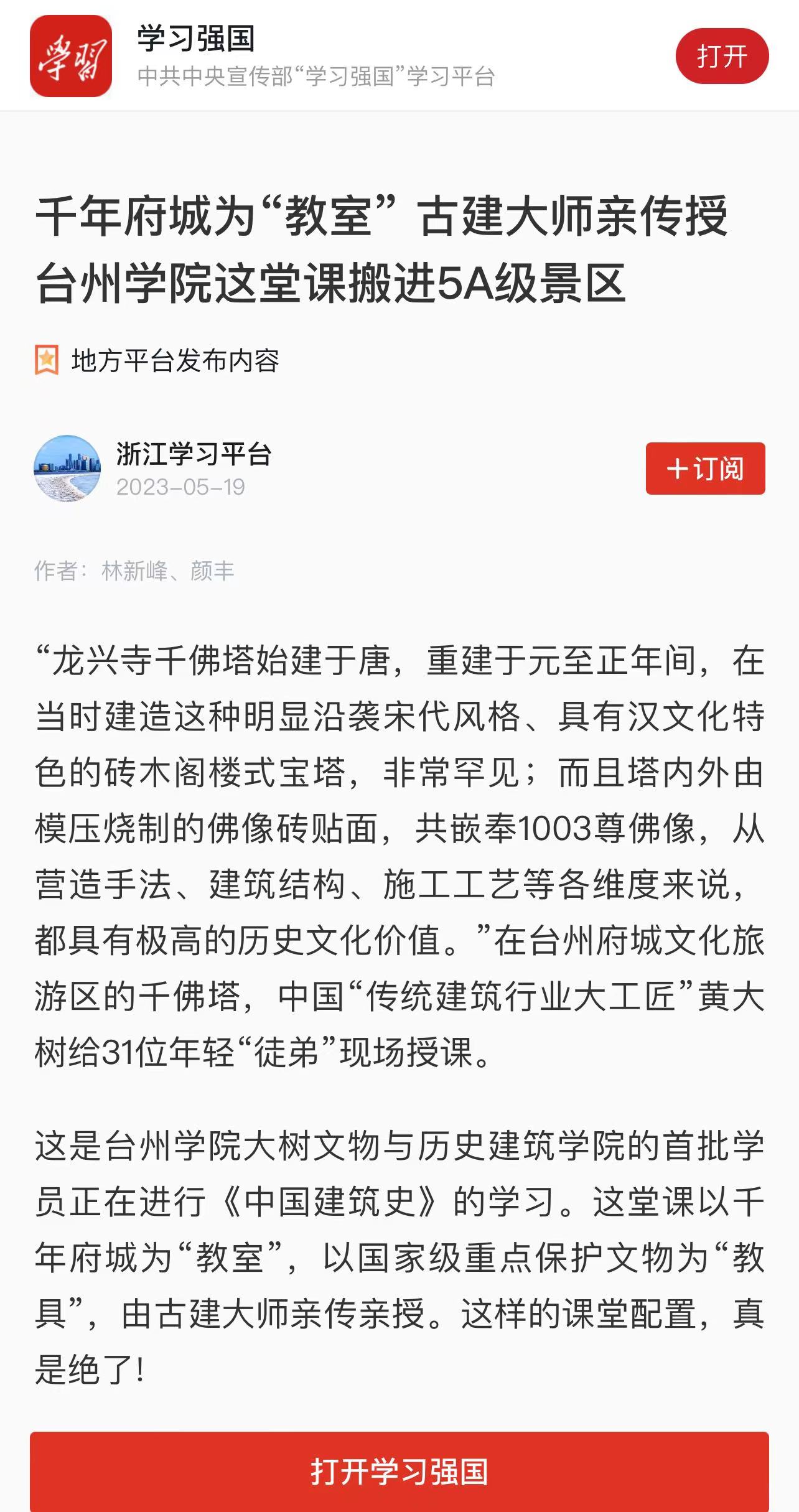 这是台州学院大树文物与历史建筑学院的首批学员正在进行《中国建筑史》的学习。这堂课以千年府城为“教室”,以国家级重点保护文物为“教具”,由古建大师亲传亲授。这样的课堂配置,真是绝了!