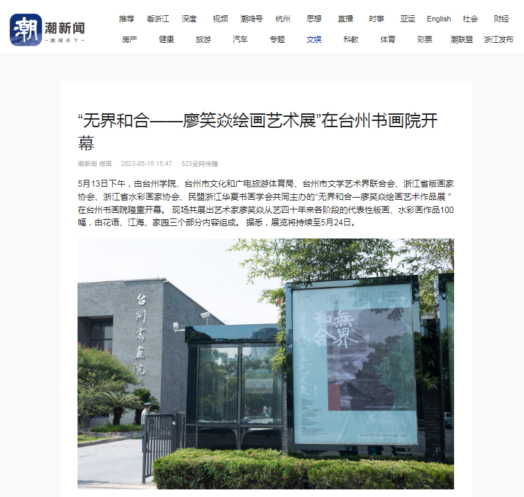 5月13日下午,由台州学院、台州市文化和广电旅游体育局、台州市文学艺术界联合会、浙江省版画家协会、浙江省水彩画家协会、民盟浙江华夏书画学会共同主办的“无界和合—廖笑焱绘画艺术作品展"在台州书画院隆重开幕。 现场共展出艺术家廖笑焱从艺四十年来各阶段的代表性版画、水彩画作品100幅,由花语、江海、家园三个部分内容组成。 据悉,展览将持续至5月24日。